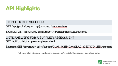 To learn more you can download the TSP API presentation below (PDF), and/or browse a tutorial on API Access to suppliers assessments.