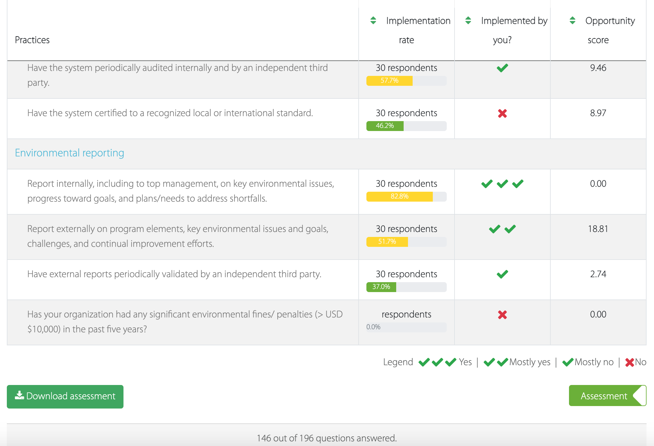Previously the implementation rate was aggregating "Yes" and "Mostly Yes" answers, while your answer was reported with green check marks. The implementation rate is now reported per option (Yes / Mostly Yes / Mostly No / No) and your answer spelled out. This makes the comparison with peers easier to understand and explain to others in your organization.