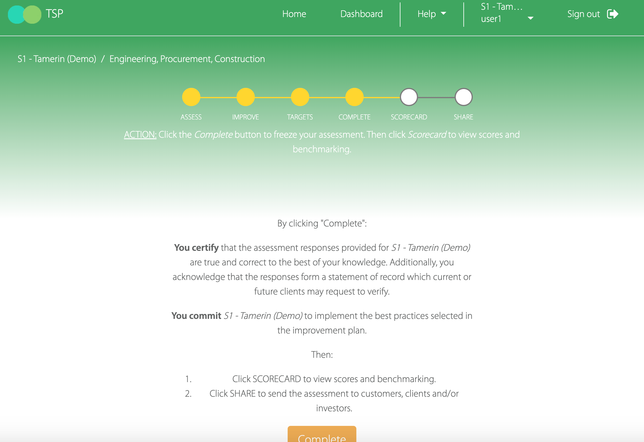 The complete step has been removed. To freeze your assessment and thus indicate it as completed, click the complete button at the bottom of the Review page.