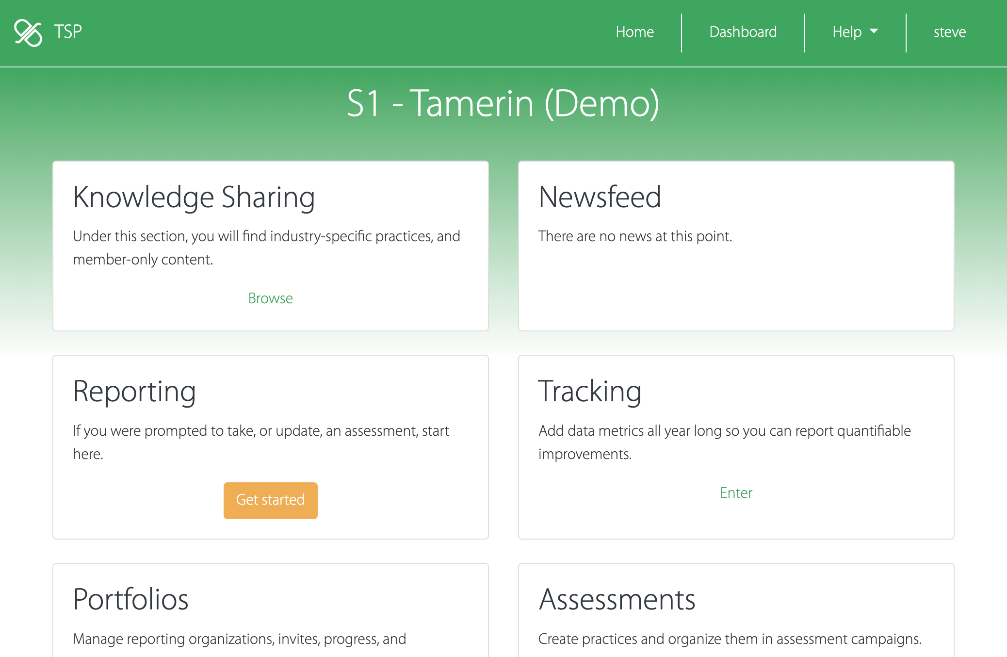 If you previously responded to a TSP sustainability assessment, click the Update button under the Reporting section. The button is labeled "Get Started" if it is the first time your organization is responding to a TSP sustainability assessment.